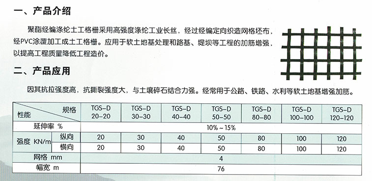 聚酯經(jīng)編滌綸土工格柵采用高強(qiáng)度滌綸工業(yè)長(zhǎng)絲,經(jīng)過經(jīng)編定向織造網(wǎng)格坯布,經(jīng)PVC涂覆加工成土工格柵。應(yīng)用于軟土地基處理和路基、堤壩等工程的加筋增強(qiáng),以提高工程質(zhì)量降低工程造價(jià)。